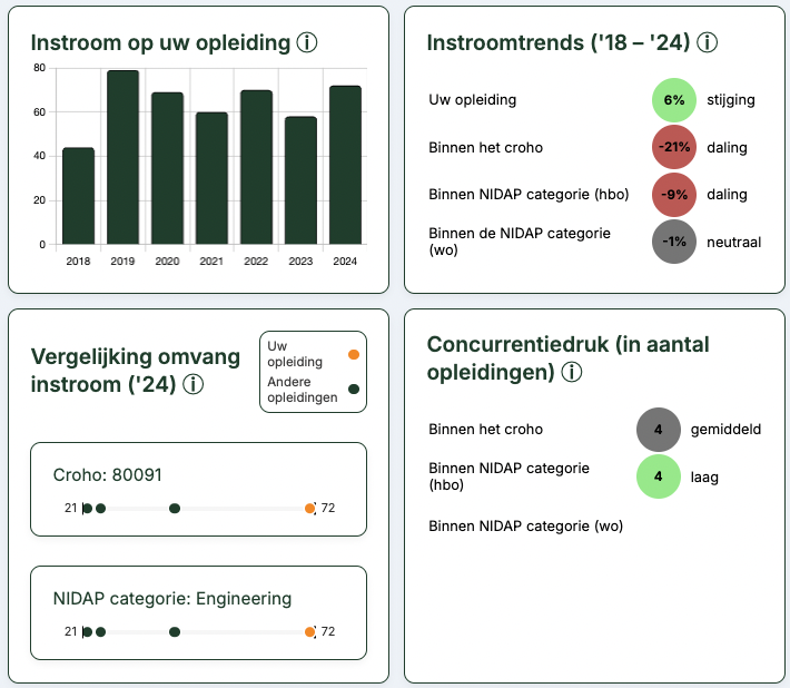 Vergelijk de instroom op uw opleiding met andere opleidingen in het hbo of wo. Bekijk hoe uw opleiding ervoor staat ten opzichte van vergelijkbare opleidingen en landelijke trends.